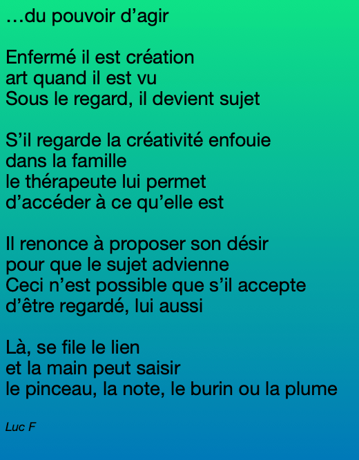 [1] Paul Valery « Soigner. Donner des soins, c’est aussi une politique. Cela peut être fait avec une rigueur dont la douceur est l’enveloppe essentielle. Une attention exquise à la vie que l’on veille et surveille. Une précision confiante. Une sorte d’élégance dans les actes, une présence et une légèreté, une prévision et une sorte de perception très éveillée qui observe les moindres signes. C’est une sorte d’œuvre, de poème (qui n’a jamais été écrit), que la sollicitude intelligente compose.»