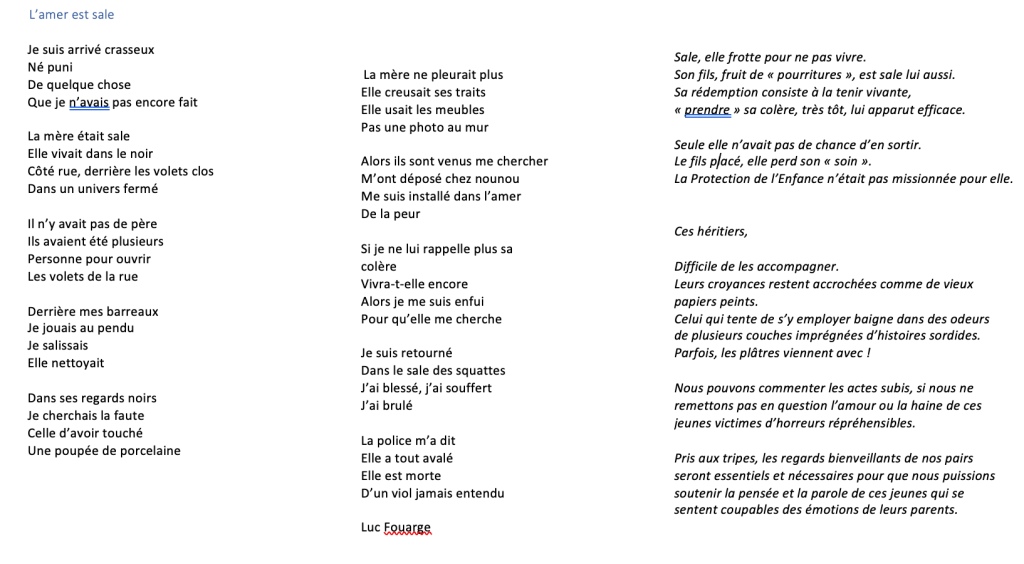 Rencontre avec une maman au travail avec un service d’intervention à domicile, jeune mère de 6 enfants, battue durant 7 ans. Une personne extraordinaire capable d’intervenir dans une salle de conférence devant 200 professionnels. « Une super aide » dit cette femme qui évoquent courageusement ses difficultés. Reportage lors d’une intervention sur l’alternative au placement par Guidance Familiale dans un colloque ENSSYCOFA, Ecole de thérapie familiale dirigée par Catherine Alfonsetti.
